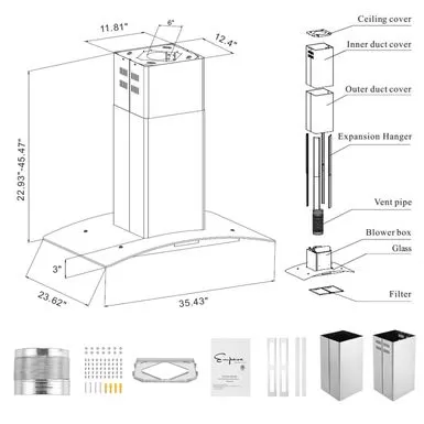 - Range Hood Dimensions: 35.43 in. W X 23.62 in. D X Adjustable 25 in. – 47.64 in. H. Aluminum Flex Duct Dimension: 6 in. Round. Pre-Installed US Standard 120v Power Cord.