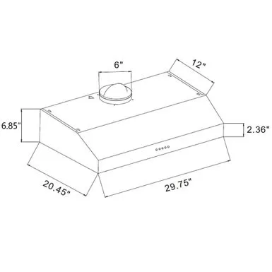 - Dimensions: 29.75 in. W X 20.45 in. D X 6.85 in. H. Duct Diameter: 6 in. Round. Pre-Installed US Standard 120v Power Cord.