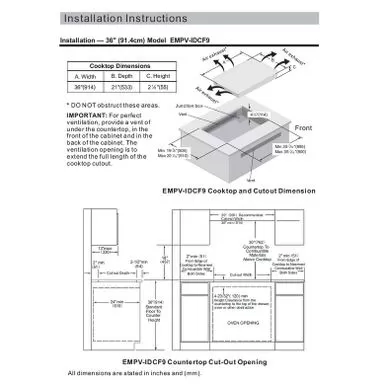 Product Dimensions: 36 in. W x 21 in. D x 2.12 in. H, Cutout Dimensions: 35.22 in W x 19.87 in D. Minimum circuit breaker amperage 50A, 240V hard wiring included, Designed and Engineered in USA with 2 Years US Based Manufacture Warranty.