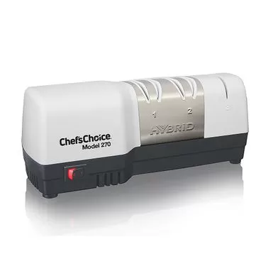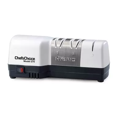 The efficient 3-Stage Chef’sChoice Diamond Hone Hybrid Model 270 is one of our most advanced Hybrids yet, combining our acclaimed CrissCross sharpening technology and electric and manual sharpening stages that provide superior edge geometry and razor sharp edges on both straight-edge and serrated knives including household and kitchen knives, sports knives, and pocket knives. The Chef’sChoice CrissCross sharpening technology is praised by home cooks and professional chefs for its extremely sharp edge with lots of “bite.” The diamond abrasive wheels sharpen simultaneously “into” and “out-of” the edge for a superior burr-free edge. Featuring elegant and durable brushed stainless steel knife guides, Stages 1 and 2 are electric using 100% diamond abrasives for fast and easy edge shaping and sharpening. Stage 3 uses ultra-fine diamond abrasive wheels for a polished, razor-sharp, arch-shaped edge that is stronger and more durable. Stage 3 also sharpens serrated edges. One year limited warranty.