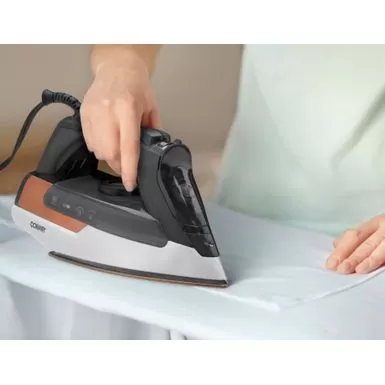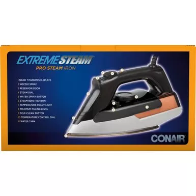 Guide this Conair ExtremeSteam Pro steam iron over clothes for even heat distribution. The Nano-Titanium soleplate glides smoothly over fabrics, and a pointed tip lets you press around buttons and over pockets and collars, so every inch of the garment looks crisp. This Conair ExtremeSteam Pro steam iron has an auto-shutoff feature for safety and a self-cleaning function to reduce maintenance time.