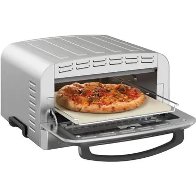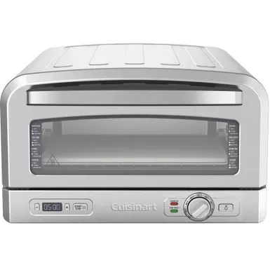 Do pizza night right with the Cuisinart Indoor Pizza Oven—a must-have for making artisanal 12” pizzas right in your kitchen. Cook authentic Neapolitan pizza in 5 minutes or less and explore other regional favorites like deep dish, Detroit style, and New York style pizzas, all customized with your favorite toppings. This countertop oven uses radiant heat to reach 700°F—the ideal temperature for cooking the crispy crust and bubbling cheese you love for the tastiest, most authentic flavor. Engineered with active cooling technology, ideal for indoor use. Includes a 12.5” heat-conducting pizza stone for delectably crispy crust, deep dish pan, and pizza peel for sliding pies in and out of the oven. Slice through the ordinary with the Cuisinart Indoor Pizza Oven.