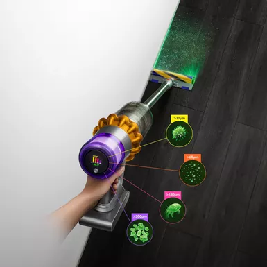 The Dyson V15 Detect is engineered with the power, intelligence, versatility, and run time to deep clean your whole home. Dyson illumination reveals invisible dust on hard floors. A piezo sensor intelligently optimizes power and run time based on the debris picked up, reporting it all on the LCD screen.³ The de-tangling Digital Motorbar cleaner head deep cleans carpets and hard floors without tangles and adapts suction power to floor type. Its versatile cordless format transforms into a handled vacuum with one click so you can clean up high, down low, and everywhere in between. Comes with a 2-year warranty and lifetime Dyson support.