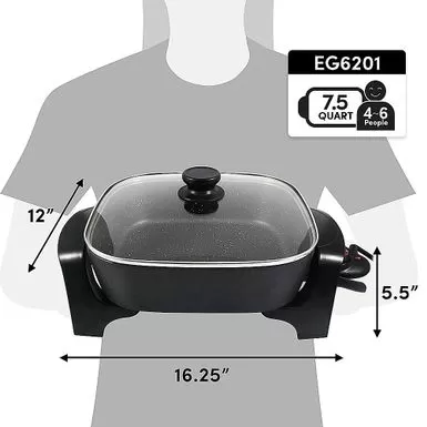 The Elite Gourmet 12”x 12” Extra-deep Electric Skillet is one of the most versatile and convenient small kitchen appliances you can own. Prepare a variety of tasty meals in minutes and without using multiple pots, pans or appliances. With its heavy-duty non-stick coating and cast-in heating element, clean-up of our fully immersible skillet is easy (upon removal of the trigger-release temperature control). Cook and serve up sumptuous meats, vegetables, soups, chili, stir-fry, and many more foods for your entire family & friends. This Extra Deep 12”x 12”x 3” electric skillet features a variable-temperature dial with a 200-400 F degrees range, as well as an indicator light to let you know when power is on and desired temperature is achieved. Tall 3″ sides and a glass lid keep moisture in and protect against splatters as you monitor cooking. With its cool-touch handles you can safely tip the skillet to drain juices for soups and gravy. The Elite Gourmet Extra-deep Electric Skillet lets you prepare meals without heating up the entire kitchen so it is among the most cost-effective of kitchen accessories.