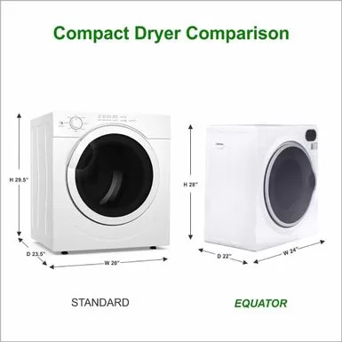 When space is at a premium, the fast and efficient Compact Short Dryer is a must. With the Equator Compact Short Dryer Model ED 852, clothing, bedding, and your whole array of laundry can be dried easily with the power of Equators smart digital drying system. Using a built-in sensor dryer, the Compact Short Dryer can automatically shut off when the items inside reach optimal dryness. The vented unit is perfect for tight spaces and comes in a 28 x 24 x 22 product footprint with a 3.5-cu ft internal capacity and 5 drying programs. It requires 120V electrical compatibility, is rated 1500 W for power and dries in 90 200 minutes depending on the settings selected. Featuring touch screen digital controls, the Compact Short Dryer looks as good as it functions, with a sleek modern design, including a transparent door reminiscent of popular full size home dryer models. This product is backed by Equators 1-year parts and labor warranty.