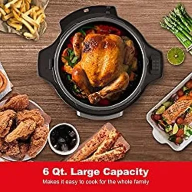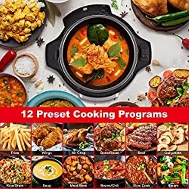 - [Ultimate Cooking Versatility]12 one-touch preset programs make it quick and easy to meet different cooking needs. Includes Fries, Wings, Air Crisp, Bake/Roast, Broil, Dehydrate, Rice/Grain, Soup, Meat/Stew, Bean/Chili, Slow Cook and Steam. Delay and keep warm settings give more flexibility for busy days when you dont necessarly have the time to cook