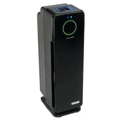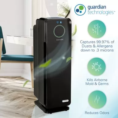 Breathe in clean and healthy air with the Germ Guardian Smart Elite air purifier tower. Equipped with WiFi and Bluetooth connectivity, this air purifier lets you monitor and control your air quality from anywhere. It features a 4-in-1 air cleaning system that fights germs, reduces odors, and provides allergy relief. The tower automatically monitors and adjusts to keep your air clean, and can be programmed using the app or UV-C Mode button.