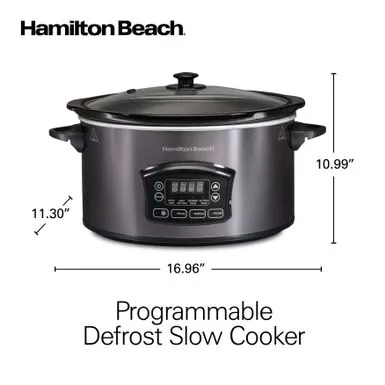 Turn your frozen food into a delicious slow-cooked meal. No more worrying that you forgot to defrost the meat ahead of time! Turn your frozen food into a delicious slow-cooked meal. No more worrying that you forgot to defrost the meat ahead of time! The Hamilton Beach Programmable Defrost Slow Cooker makes life easier by safely defrosting frozen meat and cooking it to perfection in one appliance. It has a customized temperature profile that knows how to defrost and cook to USDA food safety guidelines without overcooking. It’s easy to use, too. Simply add frozen meat and other ingredients to the slow cooker, press defrost and set your cooking temperature and time. When your food is ready, the slow cooker automatically switches to warm. The Hamilton Beach Programmable Defrost Slow Cooker also includes a temperature probe that lets you cook large cuts of meat to your desired temperature, then automatically switches to warm when food is ready. You can also cook the traditional way with this slow cooker’s program and manual modes, which let you set the timer from 30 minutes to 24 hours on high, low, or warm or select a temperature without setting a time. Includes 6 quart removable stoneware crock, glass lid and temperature probe.