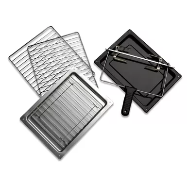 Small enough to fit on a countertop but large enough to help prepare a meal. Can fit two 12″ pizza two 9″ x 13″ casseroles or 2 cake pans. Can fit a 5lb chicken using the revolving rotisserie. Convection setting bakes faster and more evenly. Rotisserie revolves meat while cooking to lock in flavors and juices. Innovative design makes grasping & turning the control dials easier. Timer knob includes a stop mechanism. Auto shutoff 2-hour timer. Includes: Removable drip tray. Rotisserie skewer and lifter. 2 Oven racks. 2 Baking pans. Broiler rack.