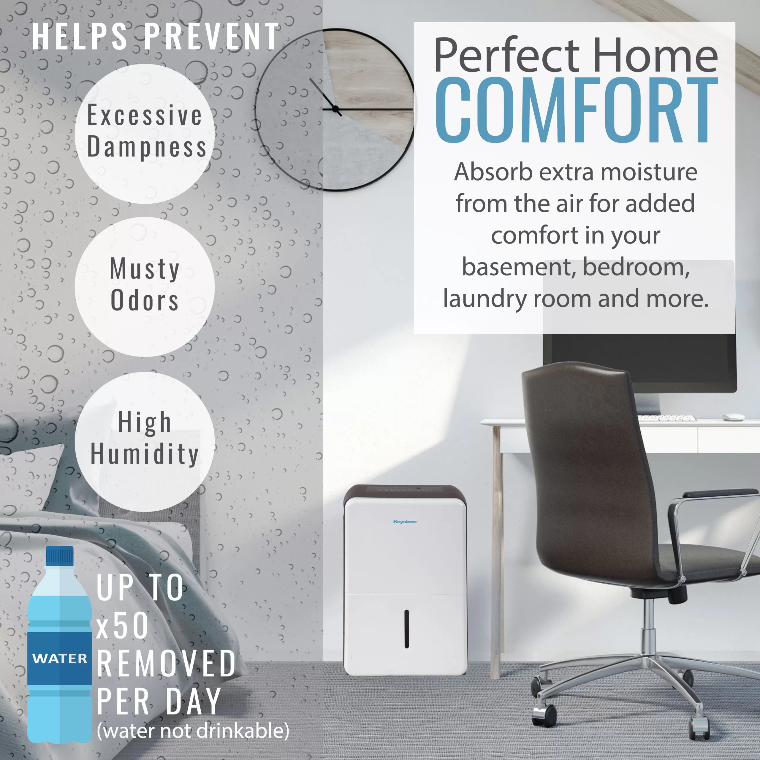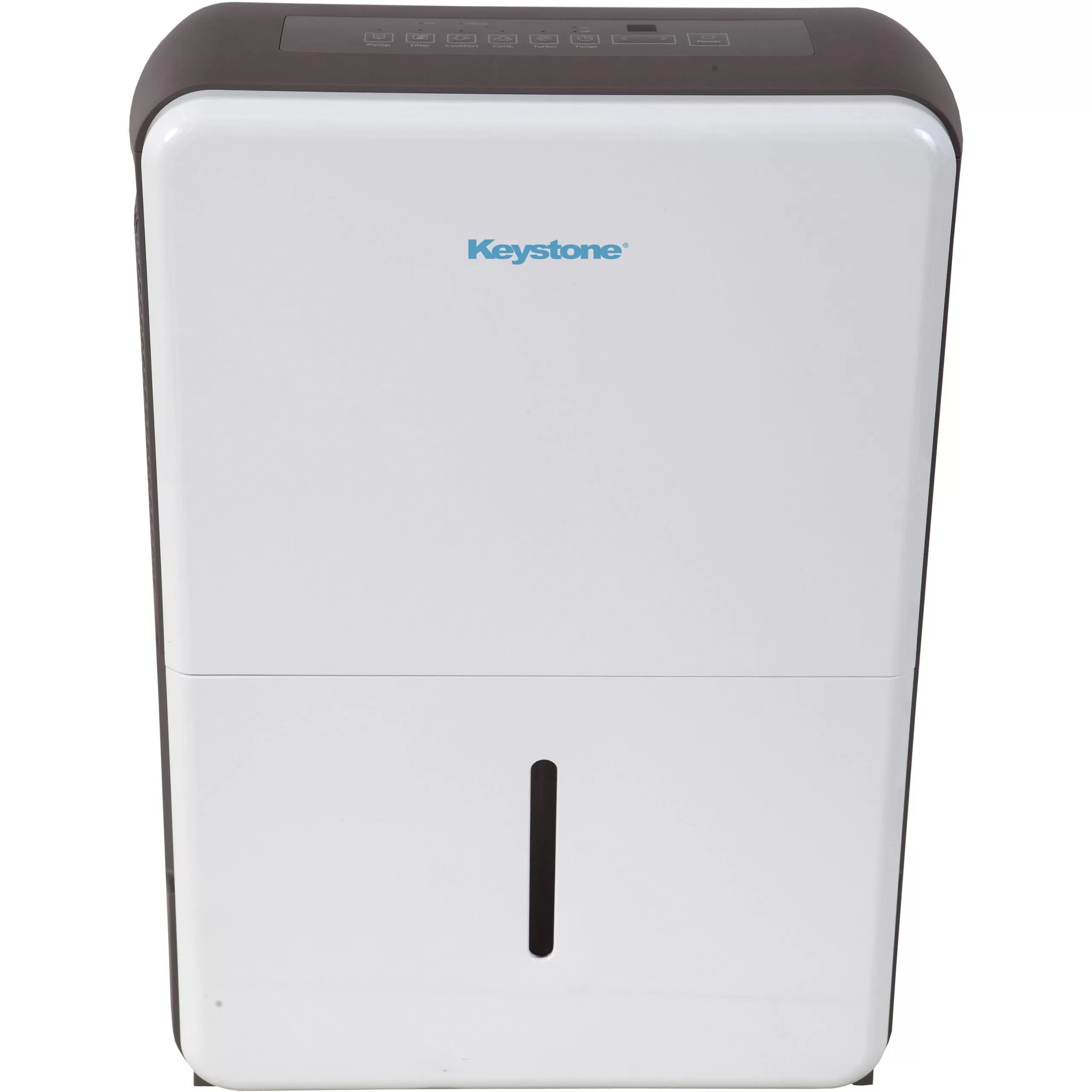 With reliable dehumidifier units, Keystone produces consistent humidity levels to keep you comfortable, even on the muggiest days. This Energy Star dehumidifier can effectively remove up to 50 pints of moisture a day to improve air quality in rooms up to 4500 square feet, which is perfect for use in basements, garages, living rooms, and much more. This unit features a convenient 1.8-gallon water tank with Full Bucket alert and auto shut-off to prevent spills and overflowing, and you’ll know when it’s time to easily remove and clean the mesh filter with the Check Filter alert. The built-in pump adds even more convenience with the option for continuous upward draining. 4 omni-directional caster wheels allow for easy portability so you can move the dehumidifier quickly whenever necessary. Keystone not only provides a 1-year warranty, but ensures that you stay comfortable at a cost-conscious price.