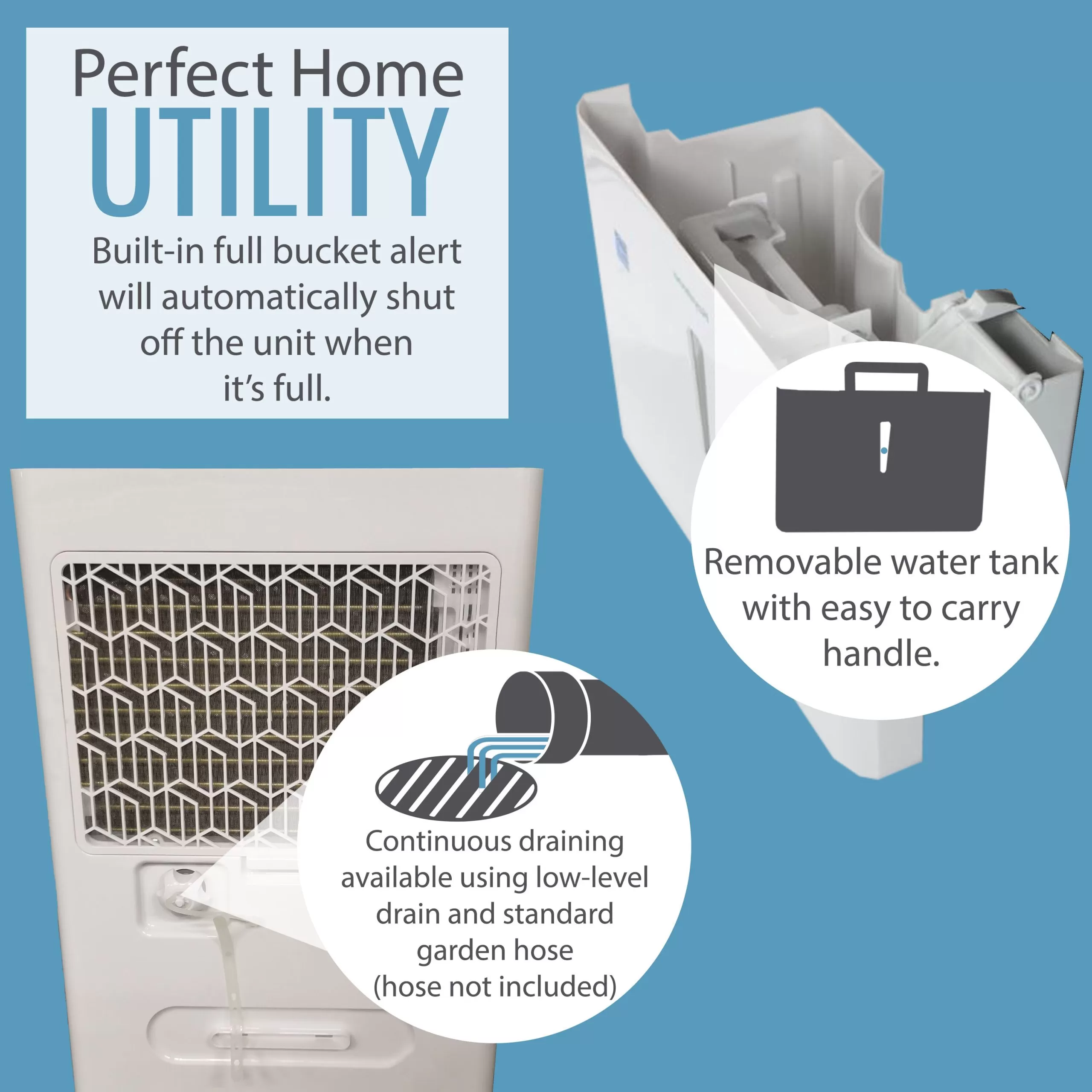 - Room dehumidifier removes up to 50 pints of moisture from the air per day