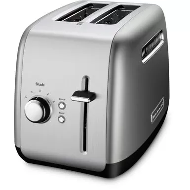 KitchenAid’s KMT2115CU 2-Slice Toaster, in contour silver, has a chrome button that glows with blue back-light illumination when in use. The extra-wide slots will accept the thickest bagels, breads, or pastries and the extra-deep, steel toasting cavity ensures even browning. The racks automatically adjust the slot width for thick or thin slices, keeping food upright for even toasting. When your food is ready, the manual high lift lever makes it easy to get it out of the toaster. Selecting the bagel toasting function reduces the power on one side of the heating elements by 50% to produce a better toasted bagel! Plus, the adjustable 5-shade setting ensures your food will pop up just the way you like it.