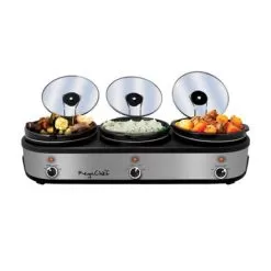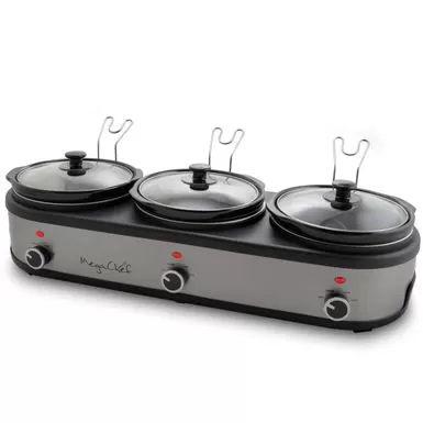 With the New MegaChef Triple 2.5 Quart Slow Cooker and Buffet Server in Brushed Silver and Black Finish with 3 Ceramic Cooking Pots and Removable Lid Rests will be your helping hand whenever you need to prepare multiple meals simultaneously without the With the New MegaChef Triple 2.5 Quart Slow Cooker and Buffet Server in Brushed Silver and Black Finish with 3 Ceramic Cooking Pots and Removable Lid Rests will be your helping hand whenever you need to prepare multiple meals simultaneously without the hustle and bustle of a restaurant kitchen! With this incredible kitchen tool, you will be able to not only cook 3 individual meals at the same time without having to monitor the stove, but you will also be able to keep those meals hot and serve them to your family and friends or guests and coworkers without breaking a sweat. This stunning slow cooker and buffer server features 3 Ceramic 2.5 Quart Cooking Pots with their own settings allowing you to control the heat level for each meal you cook. With the included detachable lid rests, your guests can easily serve themselves hassle free. Once you try serving meals with such ease it may be difficult to go without this unit again at any gathering!CUT YOUR COOKING TIME IN 3: Each of the 2.5 quart Ceramic Slow Cooker Pots is equipped with individual controls for your convenience. Allowing you to cook 3 individual dishes simultaneously! 3 SETTINGS PER EACH POT: Each Ceramic Slow Cooker Pots offers a LOW, HIGH and WARM Setting. Allowing you to not only cook 3 individual meals but keep them warm to be served to your family or guests!REMOVABLE LID RESTS: A convenient detachable lid rest is included for each of the Ceramic Slow Cooker Pots! Once you are ready to serve simply place the lids into their rests to allow easy access to the delicious meals you’ve prepared!ANTI SLIP FEET: This unit features anti slip rubber feet to ensure your Buffet Server Slow Cooker stays safely secure while you serve.CUT YOUR COOKING TIME IN 3: Each of the 2.5 quart Ceramic Slow Cooker Pots is equipped with individual controls for your convenience. Allowing you to cook 3 individual dishes simultaneously!3 SETTINGS PER EACH POT: Each Ceramic Slow Cooker Pots offers a LOW, HIGH and WARM Setting. Allowing you to not only cook 3 individual meals but keep them warm to be served to your family or guests!REMOVABLE LID RESTS: A convenient detachable lid rest is included for each of the Ceramic Slow Cooker Pots! Once you are ready to serve simply place the lids into their rests to allow easy access to the delicious meals you’ve prepared!ANTI SLIP FEET: This unit features anti slip rubber feet to ensure your Buffet Server Slow Cooker stays safely secure while you serve.1000 Watts x 3