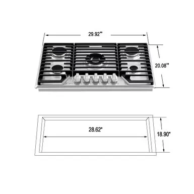 - Cutout dimensions: 28.62″ W x 18.90″ D x 7.5″ H