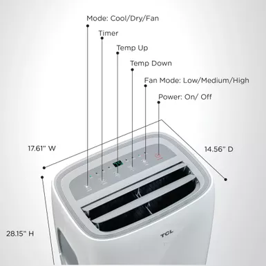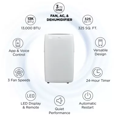 3-in-1 AC Fan and Dehumidifier is powered by 8000 BTUs. Up to 325 square feet with 3 fan speeds. Voice control compatible with Alexa or Google Assistant. Use the app to control unit schedule temperature mode and more. Simple and easy installation kit. Handles and wheels move from room to room. 24-Hour timer and Sleep mode helps keep energy bill low. Washable and reusable filter. Filter reduces large airborne particles. Dehumidifier mode. Auto-restart mode turns on automatically after a power outage. Dimensions: 17.52″ x 28.15″ x 14.56″.